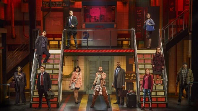 It’s all backed by the percussive, beat-box talents of Chesney Snow, who plays a zen-like subway performer named Boxman (Steven “HeaveN” Cantor in alternate performances). Boxman is the show’s underground guide to the musical’s other characters, who are stuck in life while on the move, and who often find themselves “in this limbo life between stations.” Donyale Werle’s witty subway platform of a set is an ideal fit for the Circle in the Square configuration, with the audience sitting on either side of its “tracks.” Donald Holder’s lighting and Ken Travis’ sound designs also add to the subterranean ambiance. Director Kathleen Marshall, who also choreographs, keeps things fluid, energetic and precise.