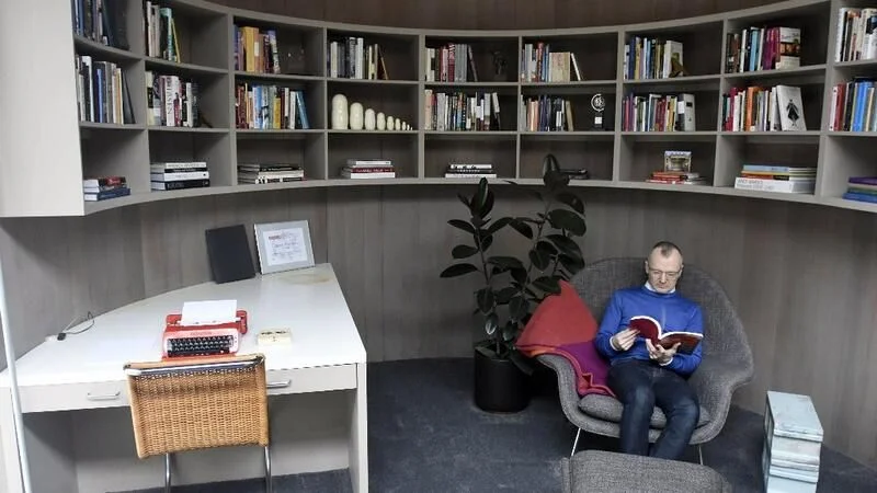A series of descending abstract Russian figures by fashion designer Martin Margiela in the home's curved study is one of the few references to the musical "Anastasia," which Darko Tresnjak is directing on Broadway this spring, following its premiere last year at Hartford Stage, where he is artistic director. (Peter Casolino | Special to Hartford Magazine)More than a year later, the couple have put their own touches on their first home, a move-in ready house designed and built for the area's developer in 1969 by award-winning architect Charles Gwathmey, who did the 1992 renovation of the Frank Lloyd Wright-designed Guggenheim Museum.