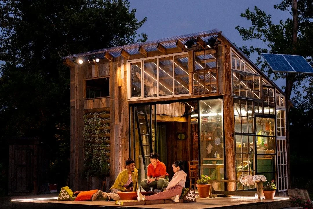 The eco-setting gives Mei Ann Teo’s very human staging an additional layer of naturalism which the trio of actors embrace. There’s a real sense of the audience eavesdropping on very personal conversations , even when the characters move inside and out of the tiny house, as well as among the different outdoor areas., including a chicken coop with real fowl, a shed, and a large vegetable garden. Special mention here to You-Shin Chen’s environmental design, Jeanette Oi-Suk Yew,’s lighting that perfectly balances with the setting sun; and Hao Bai’s crisp, 360-degree sound design. which also supplements Mother Nature as the script demands (though it can’t entirely block the distant rumbles of I-91).
