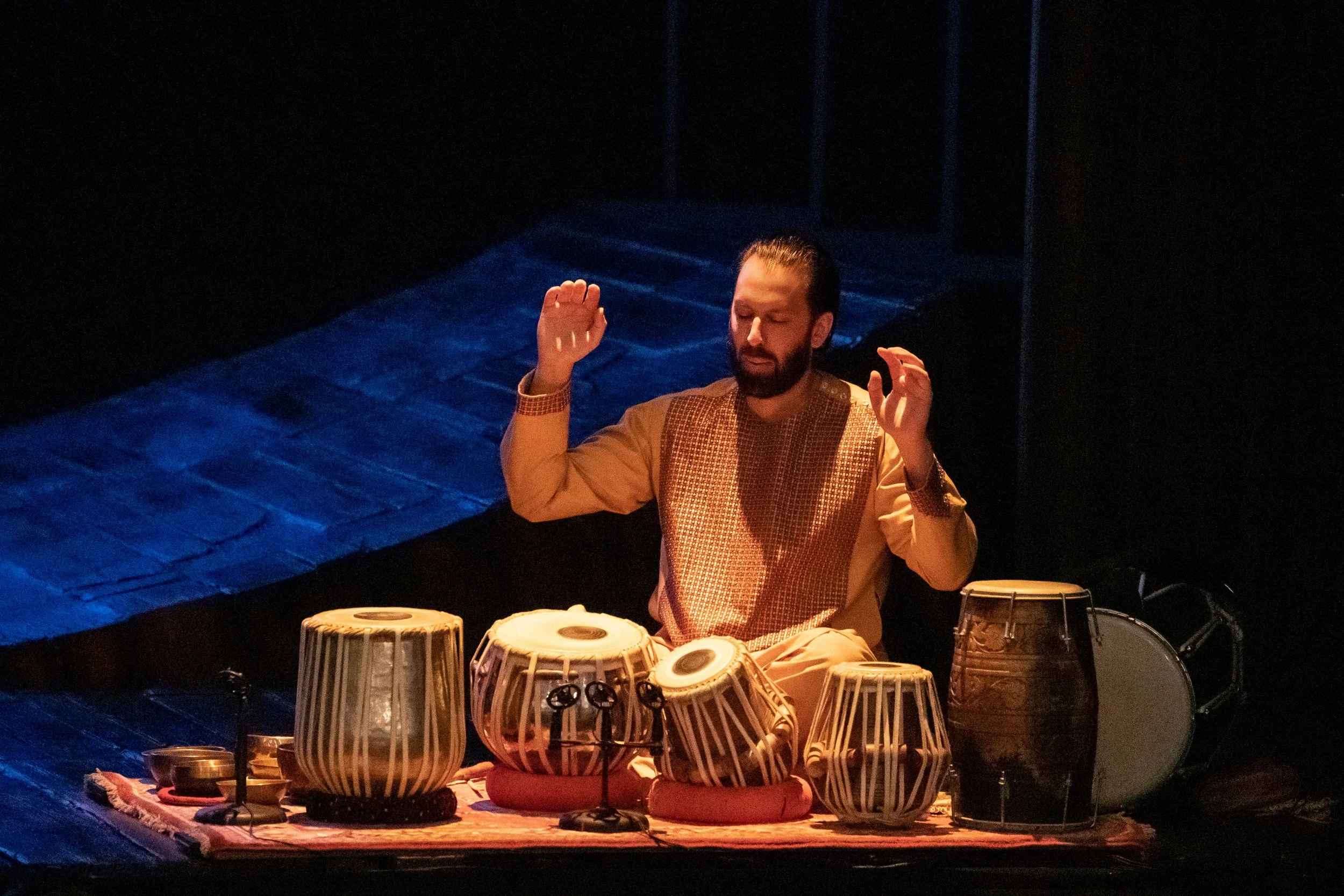 Adding to the atmosphere is an on-stage tabla artist Salar Nader and Drew Baumohl’s soundscape, Also, if you think this will be a spare two or three-hander like many narrative dramas, at least this production doesn’t scrimp. There’s 18 in the cast playing more than two-dozen characters.