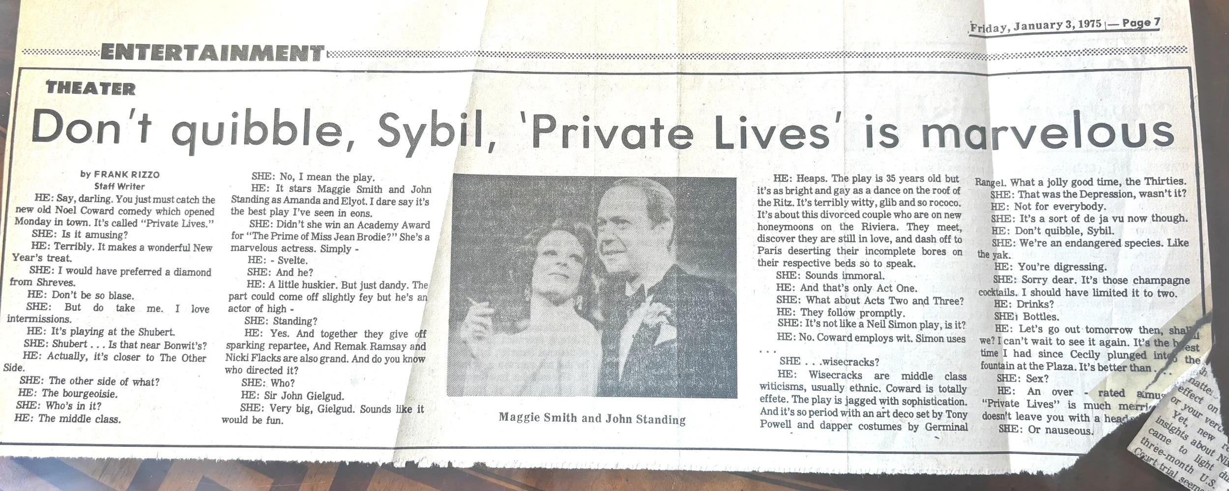 Sad news about the death of Maggie Smith. Her pre-Broadway performance in "Private Lives" in Boston in 1975 (which I saw nearly 50 years ago -- and wrote a show-off review for a suburban Massachusetts daily) was one of my top 20 stage performances of all time. I still remember her TRIPLE take on discovering her ex-husband on an adjoining hotel balcony. She was truly one of the greats.