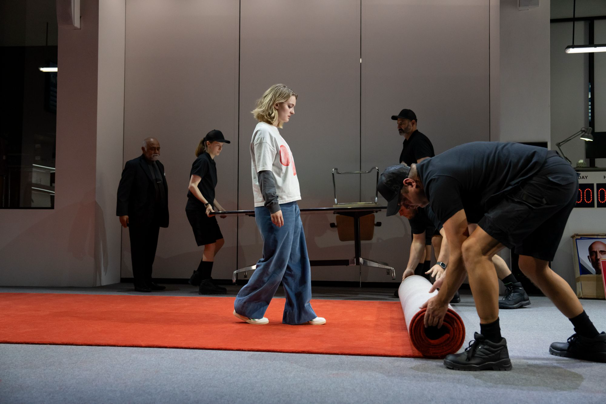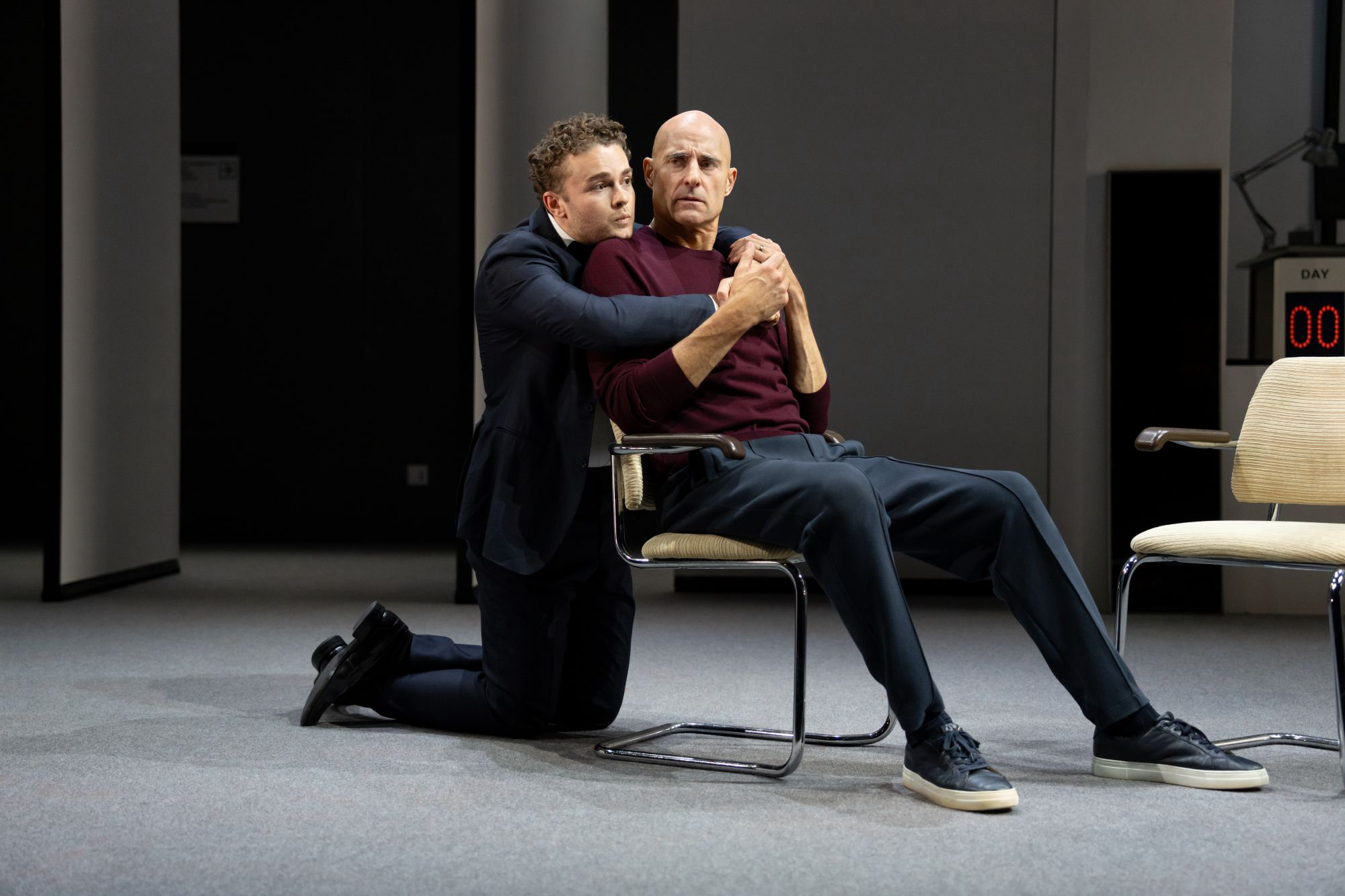 Merope (Anne Reid), Oedipus’s presumed birth mother, arrives and spends much of the night trying to talk to Oedipus privately to tell him some pivotal information about his birth but he keeps putting her off. Meanwhile, election returns come in as a digital clock ticks down, not to the moment of his victory, but to the moment of Oedipus’ shattering realization.